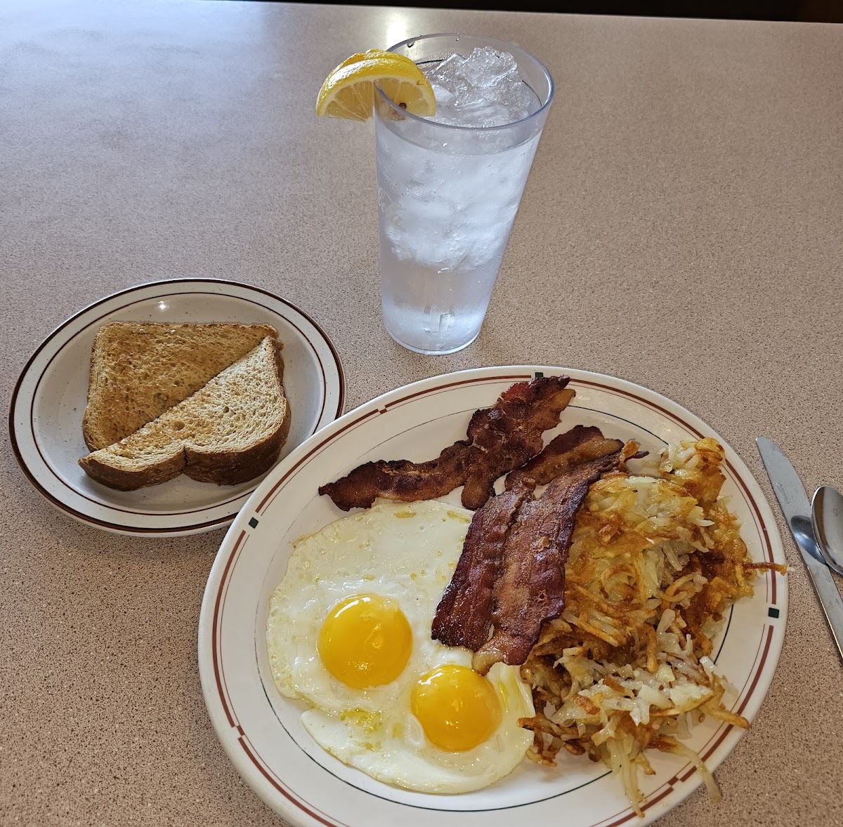 Crispy hashbrowns and bacon, how can you go wrong! Eggs were just right, and it was served within 5 minutes. A bright and cheery restaurant. Frequent, non-intrusive waitress. Overall, it was a great breakfast